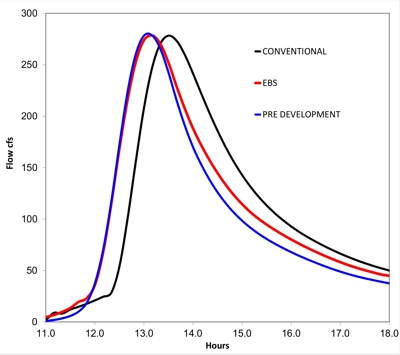 Timing:  EBS produces final hydrographs that closely match the timing and shape of the original, pre-development hydrographs.  This feature preserves the "existing" hydrology and makes development nearly transparent in the environment.